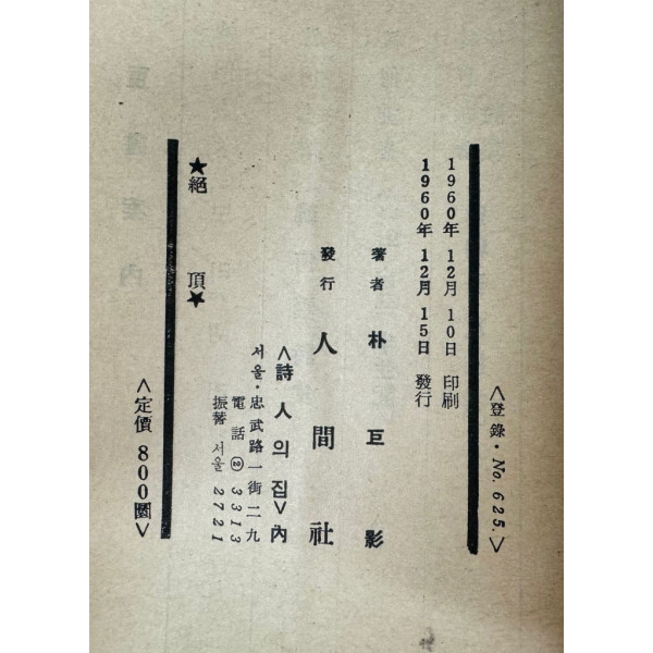 절정 / 박거영 / 1960년 초판 / 공초 오상순시인에게 증정한책 / 인간사 / 239페이지