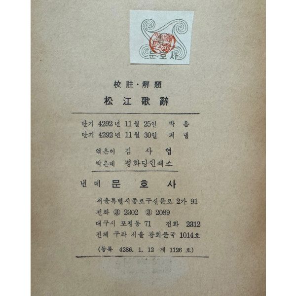 뒤로 교주 해제 송강가사 / 김사엽 / 문호사 / 1959년 초판 / 239페이지 > 고서