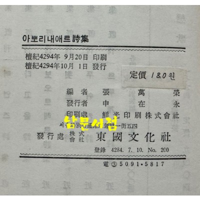 아뽀리내애르시집 / 동국문화사 / 1961년 초판 / 232페이지 요약정보 및 구매