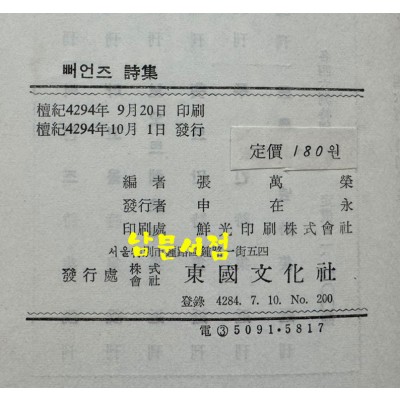 뻐언즈시집 / 동국문화사 / 1961년 초판 / 237페이지 > 시 詩